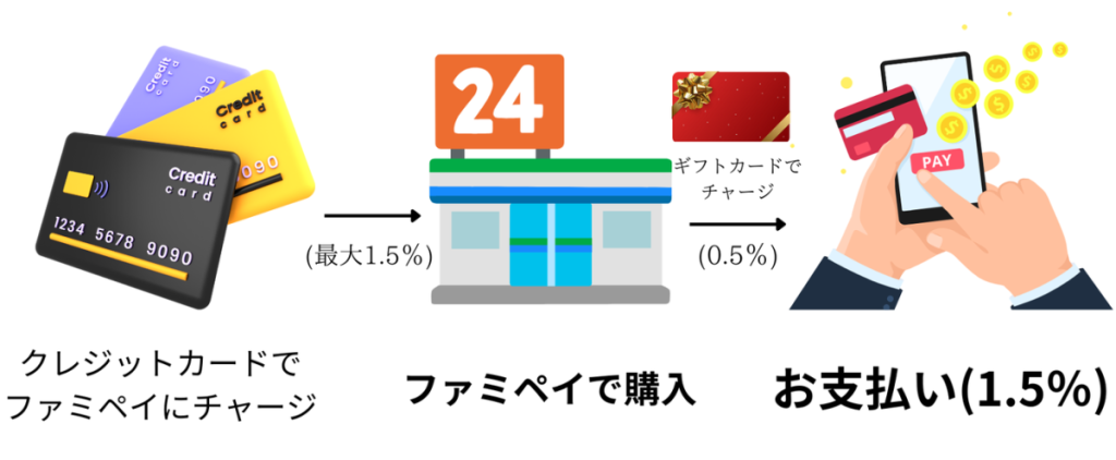 ファミペイへのチャージでクレジットカードのポイントを獲得し、ファミペイの支払いで0.5%還元を得るルートです。