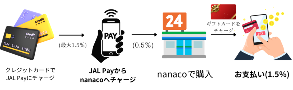 JAL payへのチャージでクレジットカードのポイントを獲得し、JAL PayからApple Payでのnanacoへのチャージで0.5%還元を得るルートです。